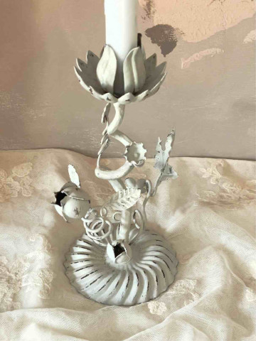 VECCHISSIMA BASE DA LAMPADA UTILIZZATA COME CANDELIERE, IN METALLO DIPINTO A MANO COLOR AVORIO