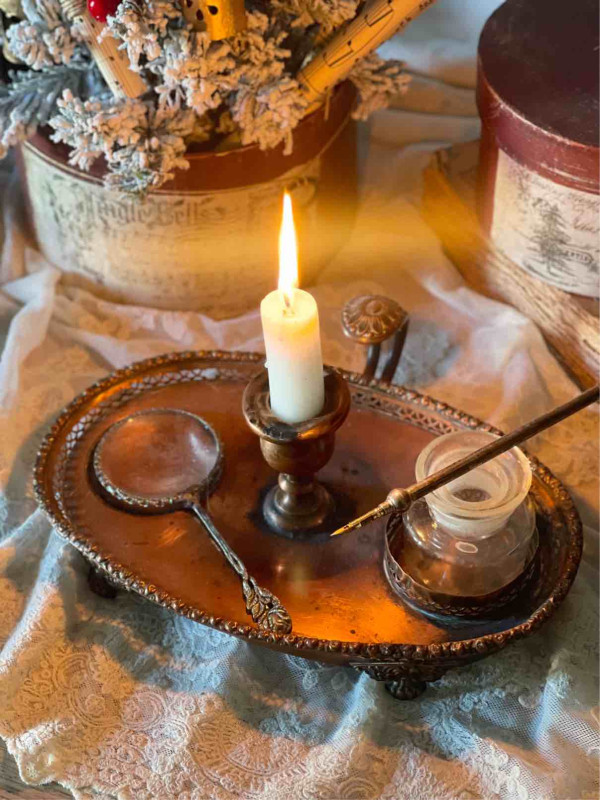 AL SUO INTERNO SI TROVANO UNA LENTE DI INGRANDIMENTO CON GHIERA E MANICO ARGENTATI, L'ALLOGGIAMENTO PER LA CANDELA PER POTER SCRIVERE IN ASSENZA DI LUCE, IL CALAMAIO IN VETRO E UN PENNINO CON MANICO ARGENTATO