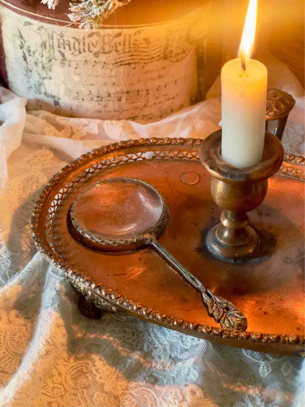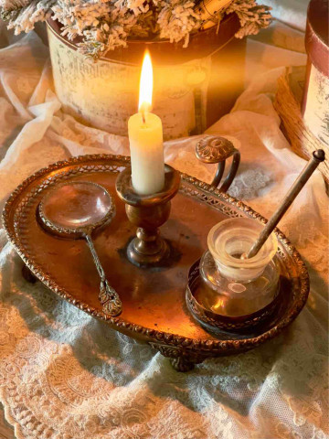 PERFETTA CON ALL'INTERNO FIORI, CANDELE, PERGAMENE DI MUSICA O PICCOLI LIBRI ANTICHI