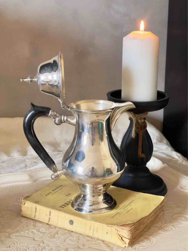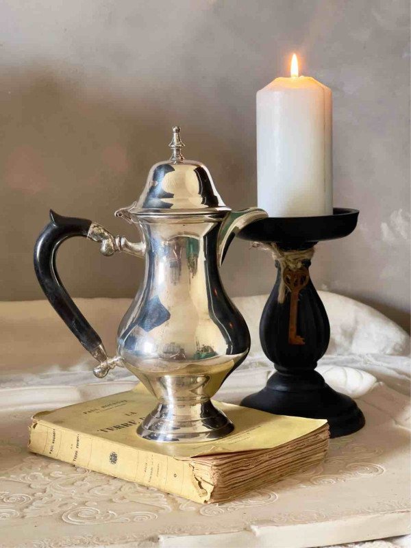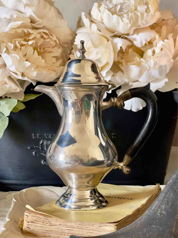 ELEGANTE VECCHIA CAFFETTIERA IN SHEFFIELD CON DECORAZIONE FLOREALE E MANICO SINUOSO