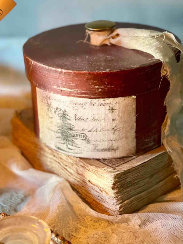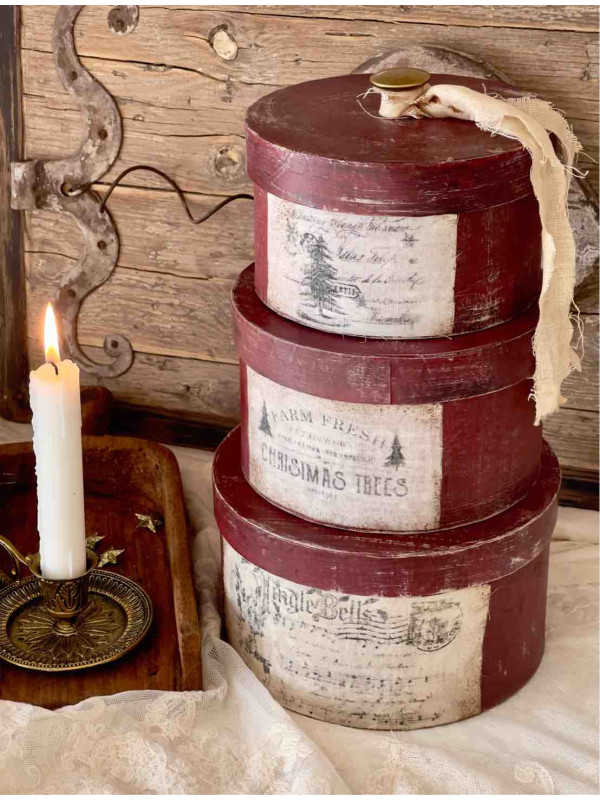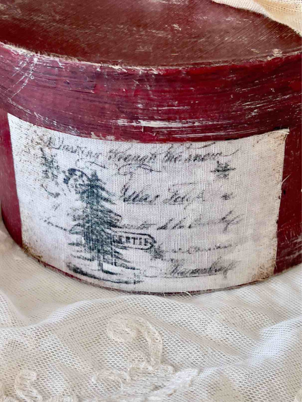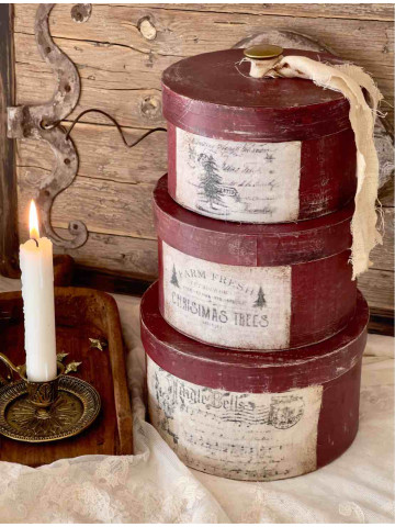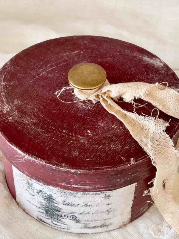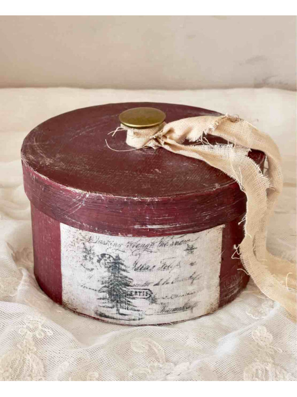 RAFFINATA CAPPELLIERA DI NATALE COLORE BORGOGNA CON ETICHETTA E NASTRO IN LINO E PICCOLO POMELLO IN METALLO DORATO SUL COPERCHIO