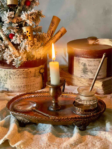 L'ETICHETTA NATALIZIA CON DECORAZIONE VINTAGE E LA FINITURA A CERA, COSì COME IL LINO INVECCHIATO A REGOLA D'ARTE LA FANNO SEMBRARE ANTICA E LA RENDONO PERFETTAMENTE INSERIBILE IN MISE EN SCENE DI GUSTO RETRO