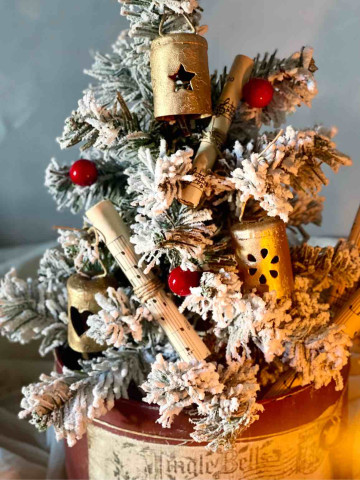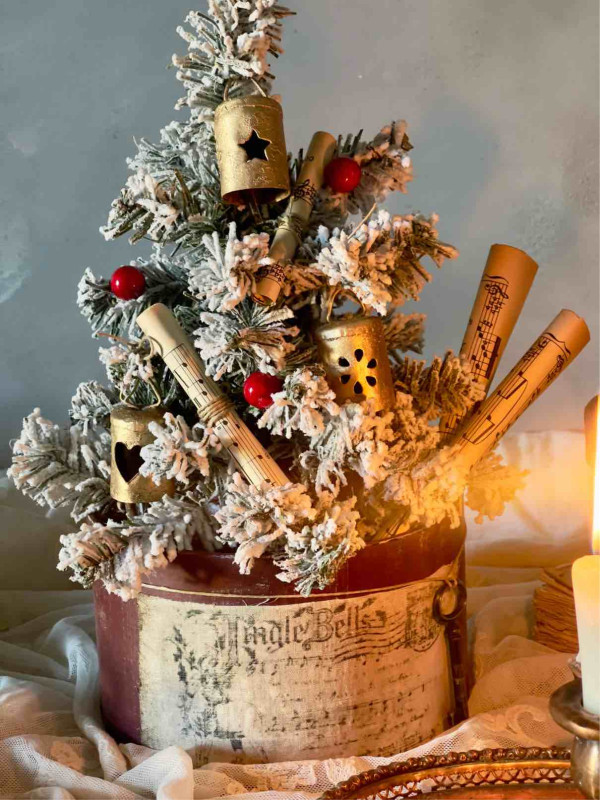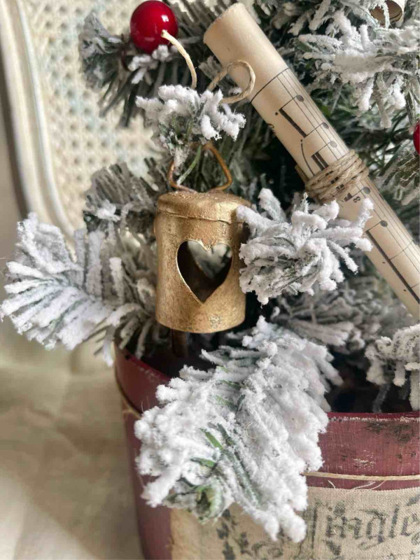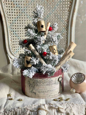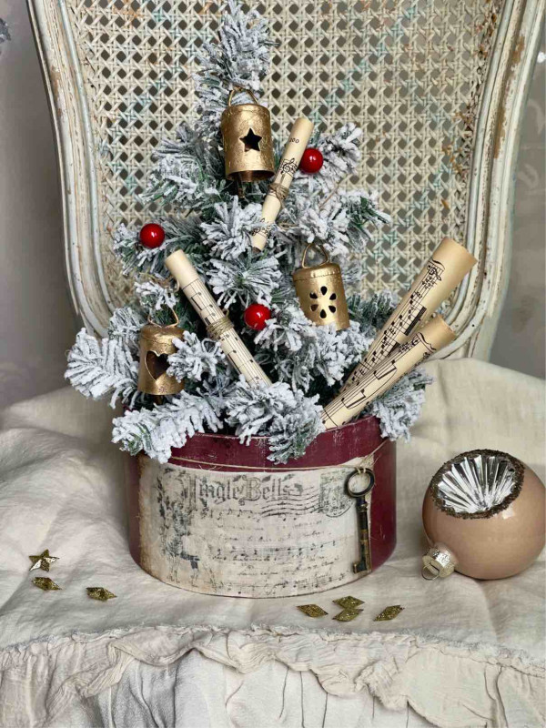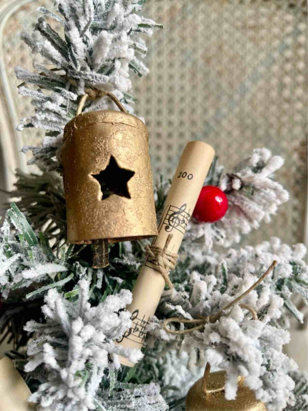 L'ALBERO E' ADDOBBATO CON: UNA STELLA IN VETRO CON CAMEO, DUE SONAGLI A FORMA DI ALBERELLO IN RUGGINE, DUE PERGAMENE DI CARTA DA MUSICA ORIGINALE DEI PRIMI DEL NOVECENTO, DUE CAMPANELLI IN METALLO DORATO RIFINITI A MANO, DUE SONAGLI IN METALLO BIANCO INNEVATO E DUE RAMETTI A FOGLIOLINE ORO