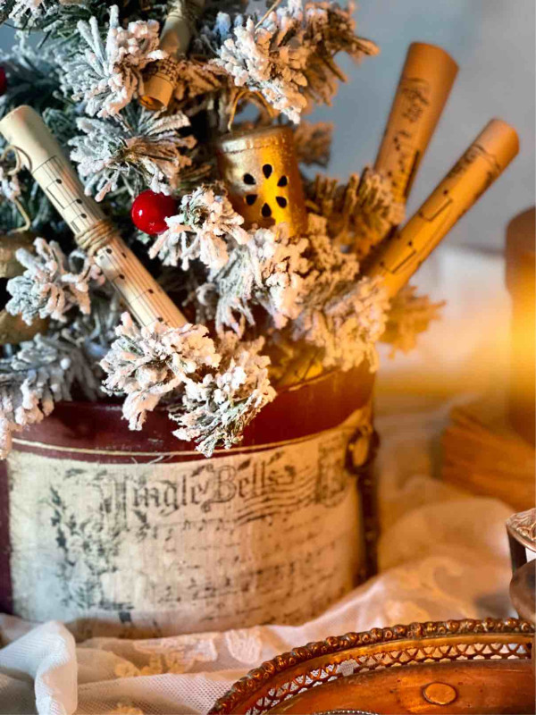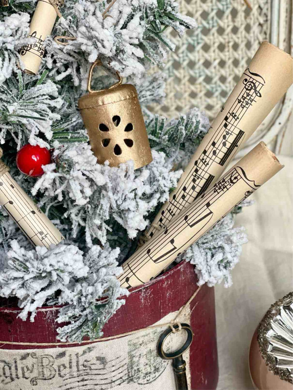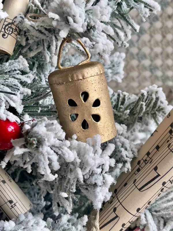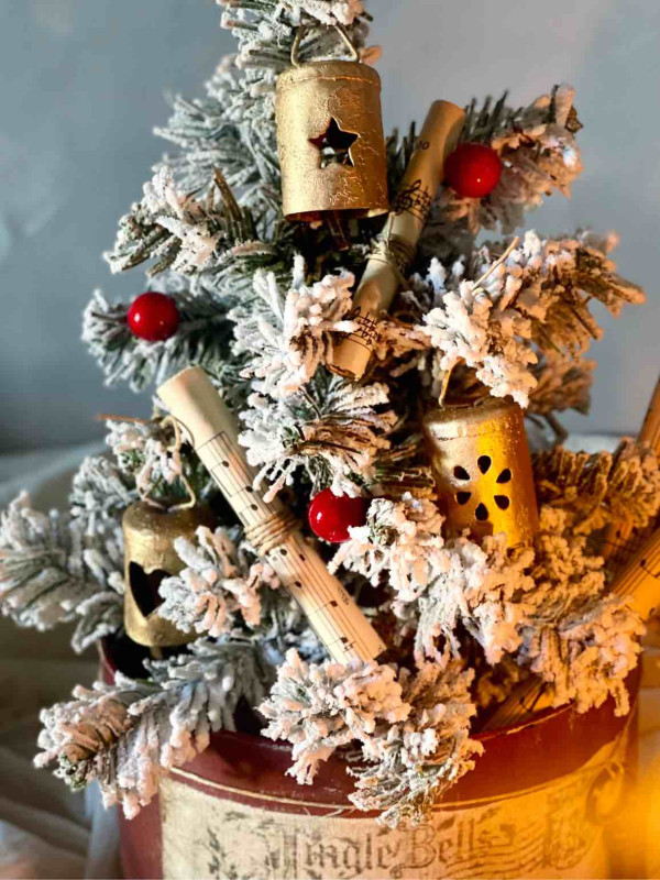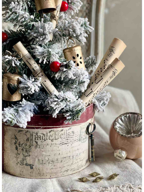 L'ALBERO E' ADDOBBATO CON: TRE CAMPANELLI A IN METALLO DORATO RIFINITI A MANO, QUATTRO PERGAMENE DI CARTA DA MUSICA ORIGINALE DEI PRIMI DEL NOVECENTO E PICCOLE PALLINE DI VISCHIO ROSSO