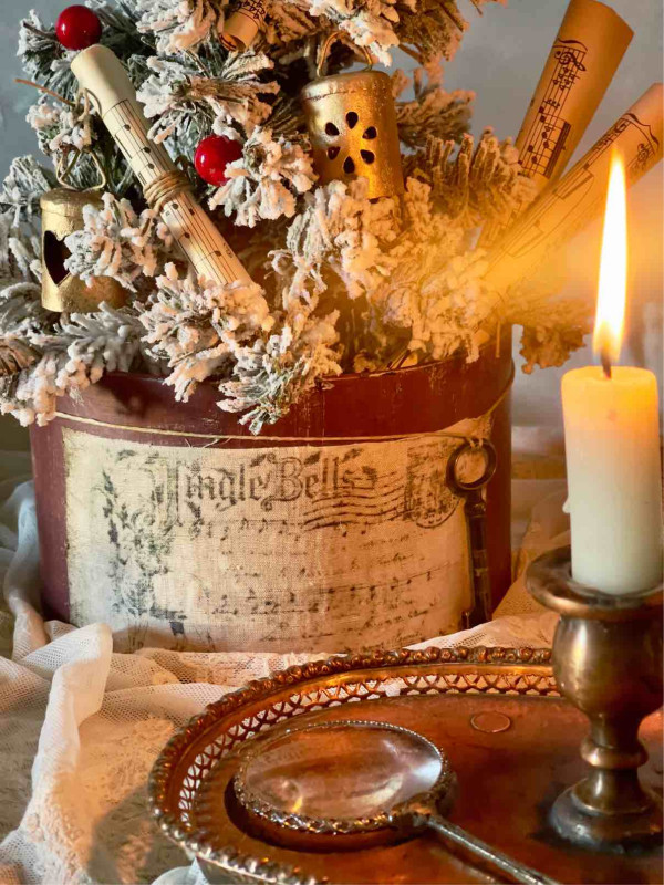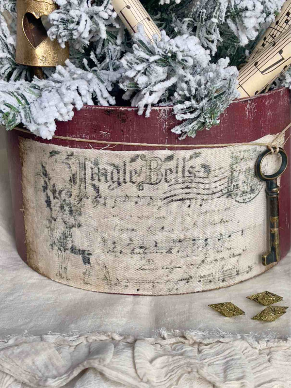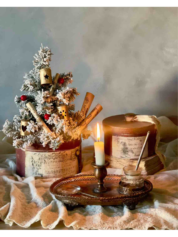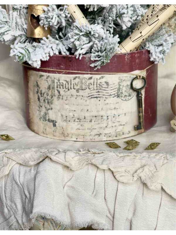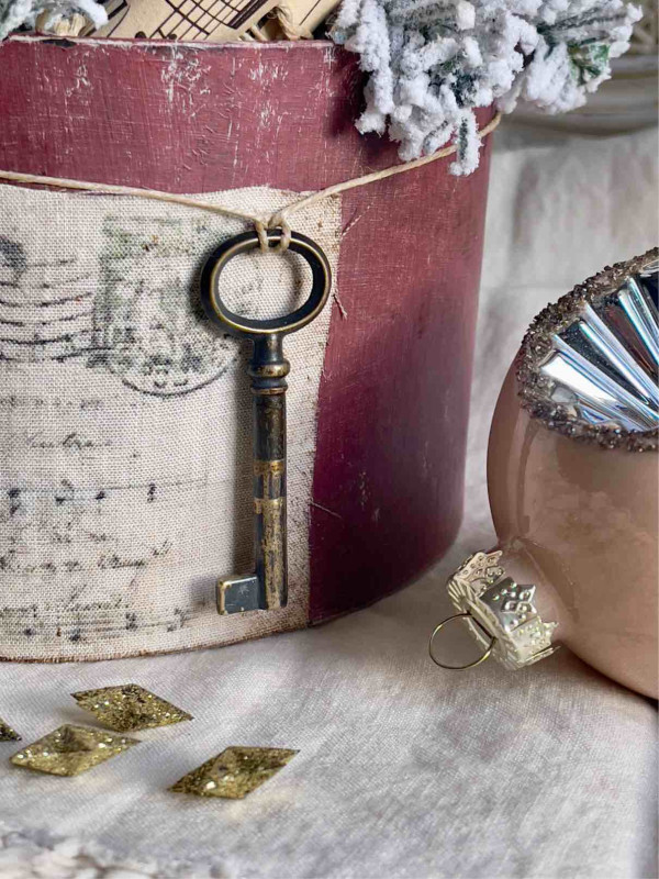 DELIZIOSO ABETE ARTIFICIALE INNEVATO IN UNA CAPPELLIERA DIPINTA A MANO E DECORATA CON UNA ETICHETTA STILE VINTAGE IN LINO INVECCHIATO E CON UNA CHIAVE ANTICA