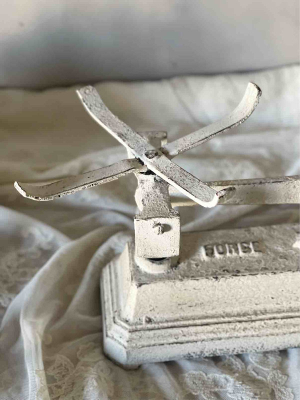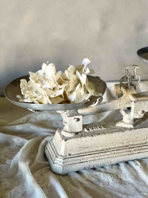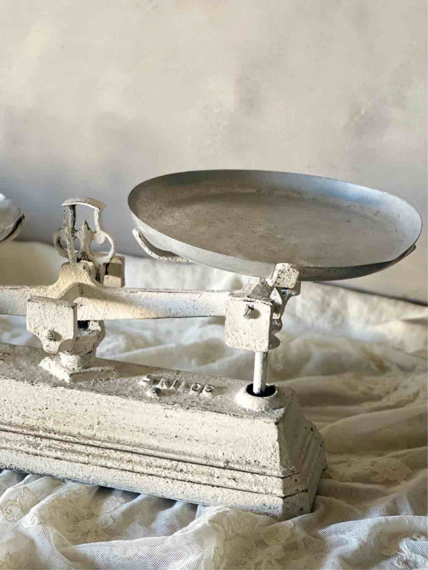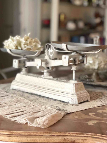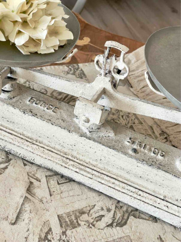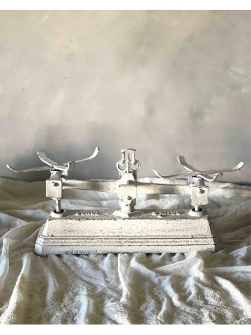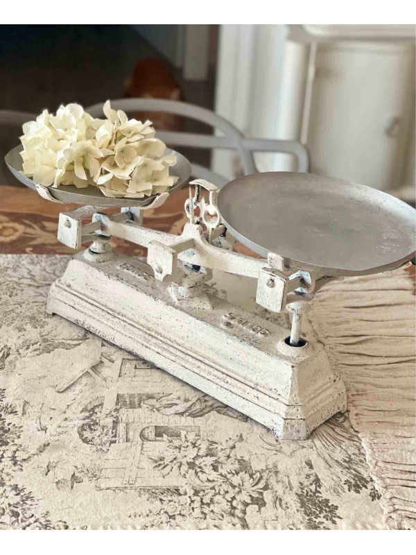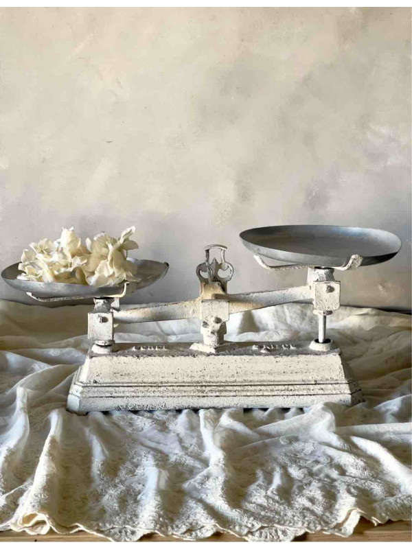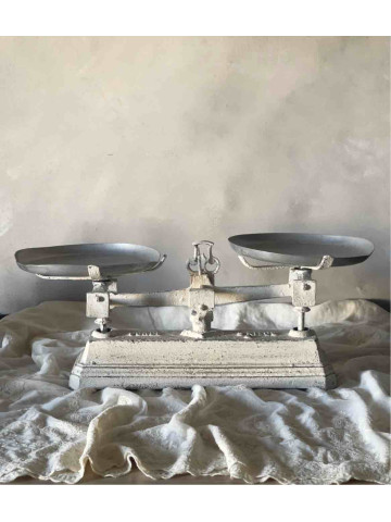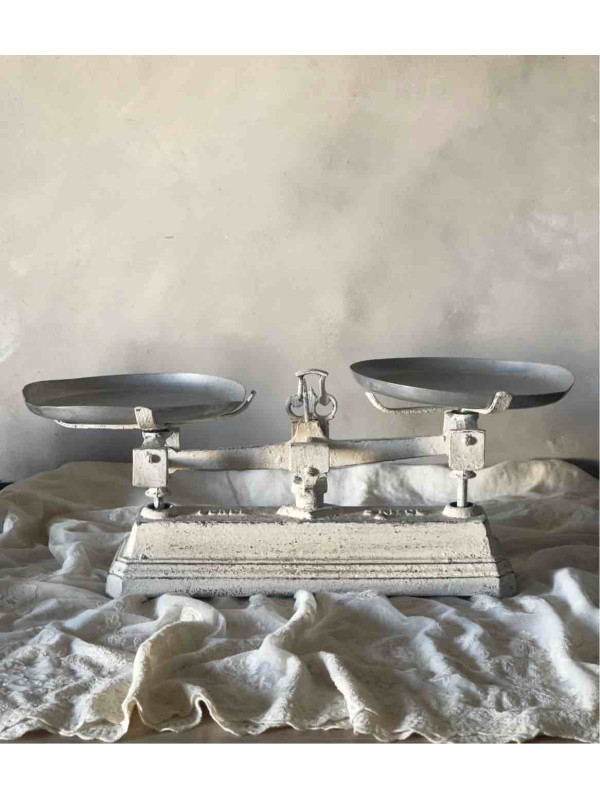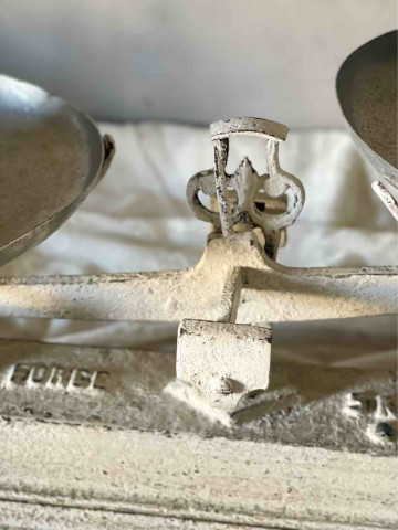 BELLA E GRANDE BILANCIA FRANCESE BROCANTE, IN GHISA CON PATINA BEIGE CHIARO E DUE PIATTI IN LEGA DI ALLUMINIO