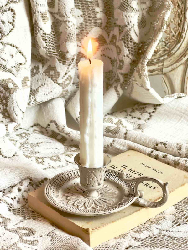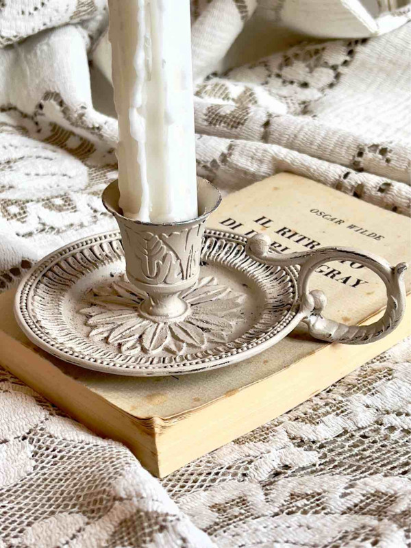 ELEGANTE PORTACANDELA IN METALLO, DIPINTO IN UNA DELICATA SFUMATURA DI TORTORA E CARTEGGIATO PER CREARE UNA PATINA ANTICA