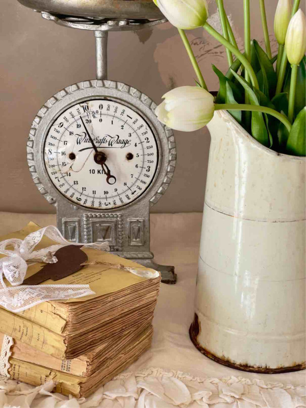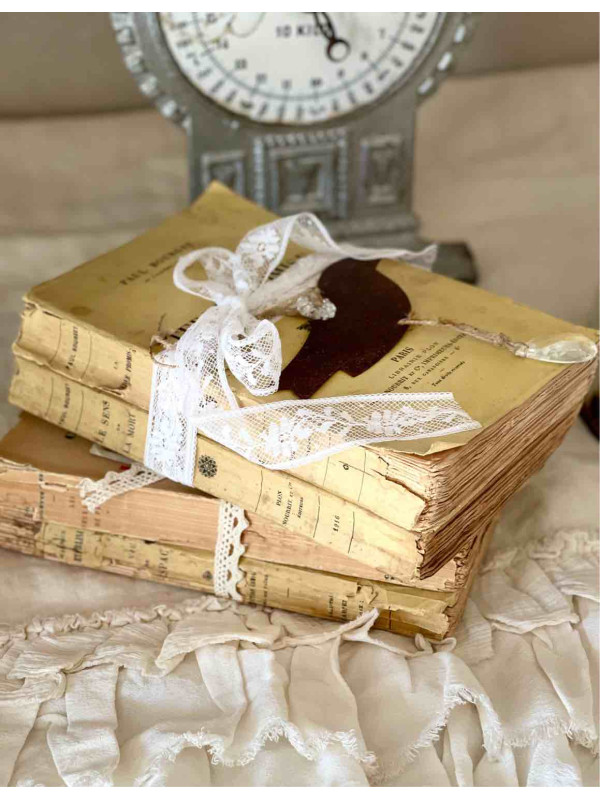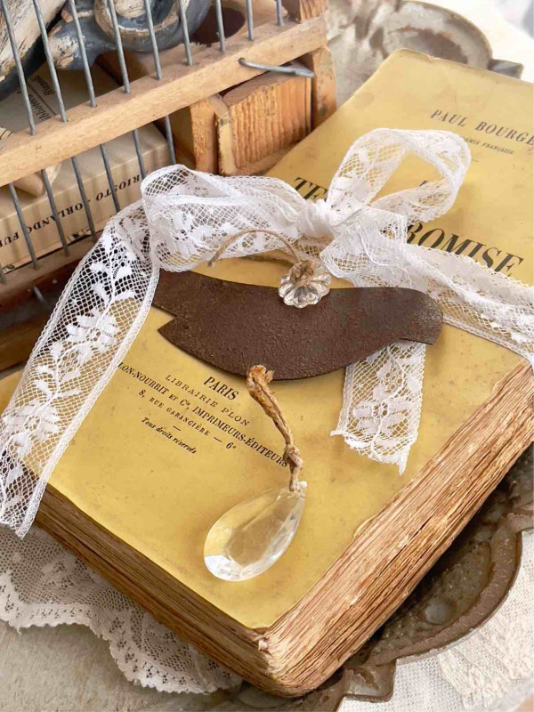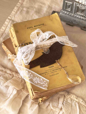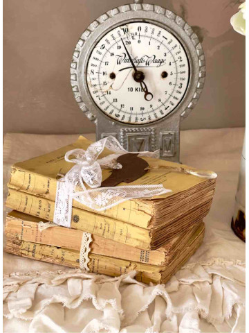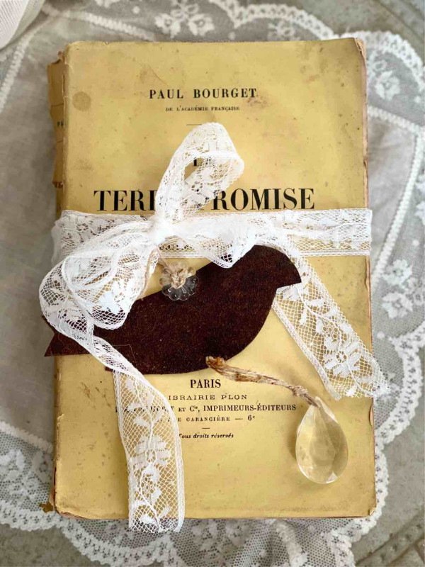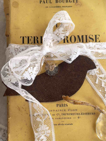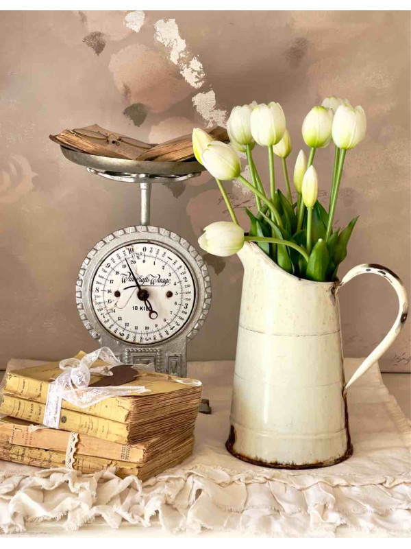 AL SUO INTERNO CARTA DA MUSICA ORIGINALE DEI PRIMI DEL NOVECENTO, UN VECCHIO LIBRO, UN FREGIO IN LEGNO DIPINTO A MANO COLORE GRIGIO ARDESIA E BEIGE CHIARO, UNA VECCHIA FOTO DELLA PRIMA META' DEL NOVECENTO CON CORNICE DIPINTA A MANO COLORE BEIGE CHIARO, UNA PICCOLA SVEGLIA BROCANTE DIPINTA A MANO COLORE BEIGE CHIARO E UNA PICCOLA ORTENSIA AVORIO IN TESSUTO