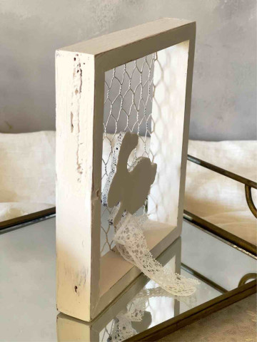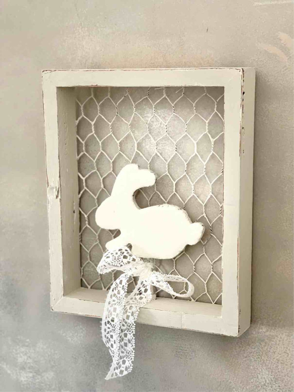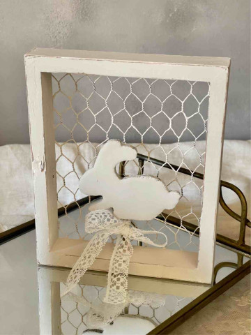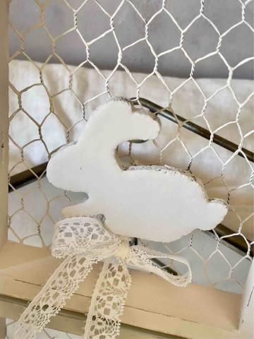 DELIZIOSO E TENERO CONIGLIETTO IN PIZZO FRANCESE COLOR AVORIO INVECCHIATO CON SCIARPINA IN LINO TORTORA
