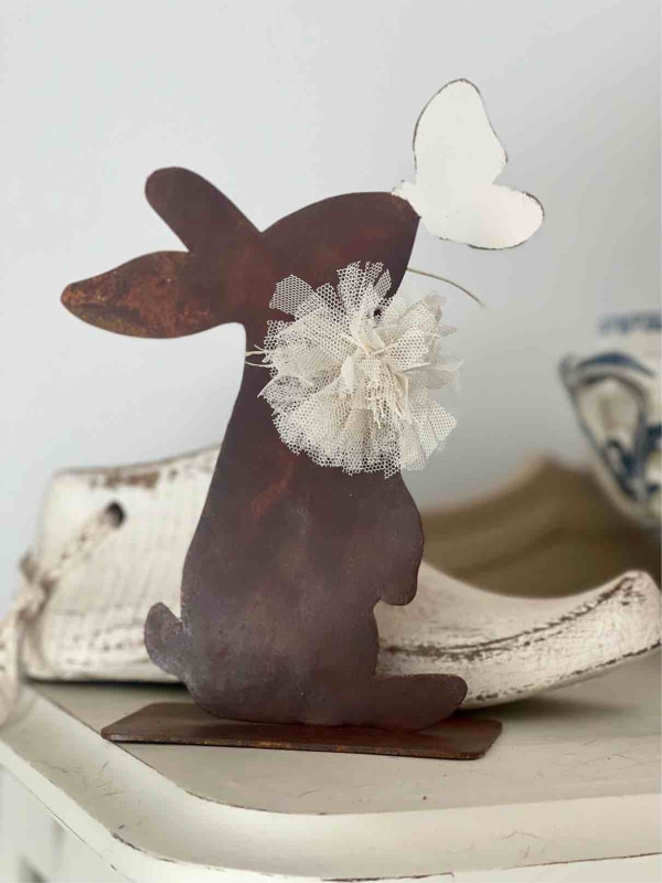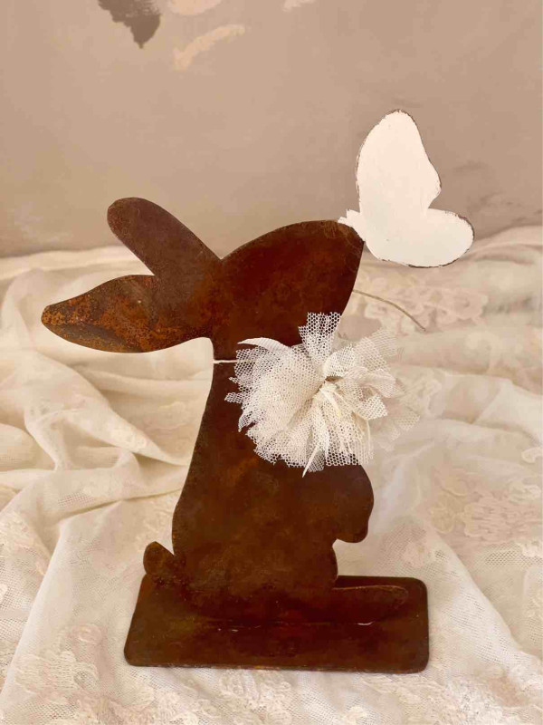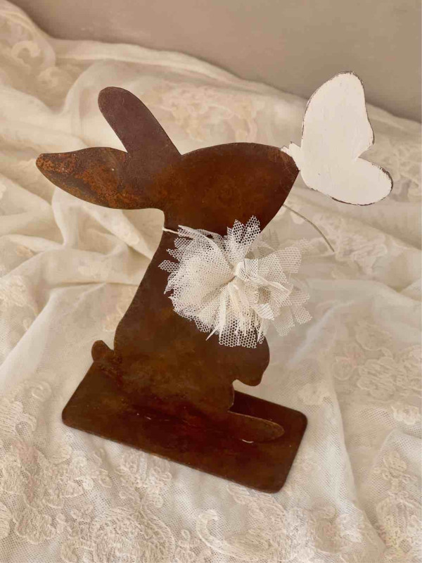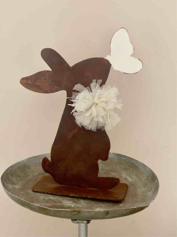 BELLISSIMO CONIGLIO ARTIGIANALE IN RUGGINE CON FARFALLA DIPINTA A MANO E PON PON AL COLLO