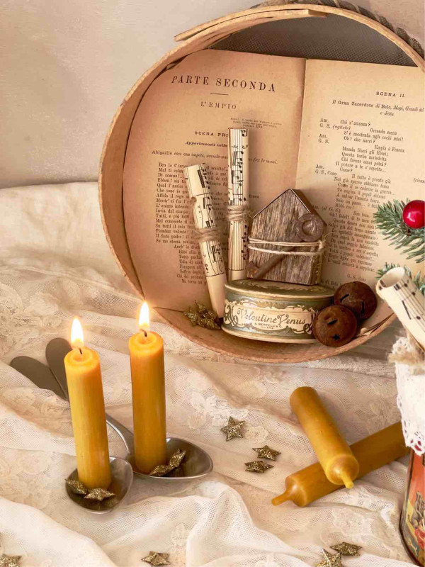 Piccola composizione con quattro candeline giallo miele legate con lo spago