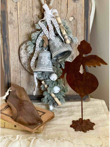 CREATA SU UN RAMO DI ABETE INNEVATO CON PIGNE GIA' PREDISPOSTO PER ESSERE APPESO, SI COMPONE DI DUE GRANDI CAMPANE IN METALLO GRIGIO CHIARO CON I FIOCCHI DI NEVE BIANCHI, TRE SONAGLI IN METALLO BIANCO, DUE PERGAMENE DI CARTA DA MUSICA E NASTRI IN PIZZO BIANCO.